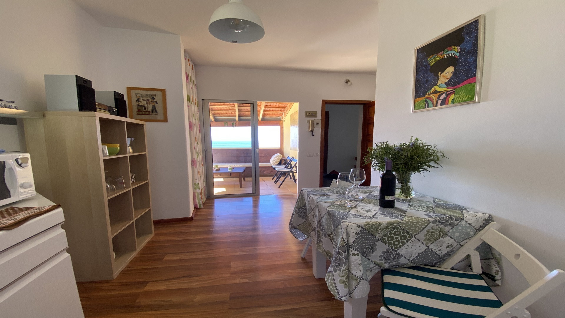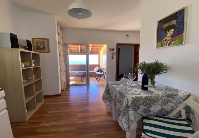 The property has a comfortable and bright bedroom, a full bathroom and a fully equipped kitchen. It also has a balcony with views and a large terrace with a wooden pergola, perfect for relaxing in the shade and enjoying the sunsets.